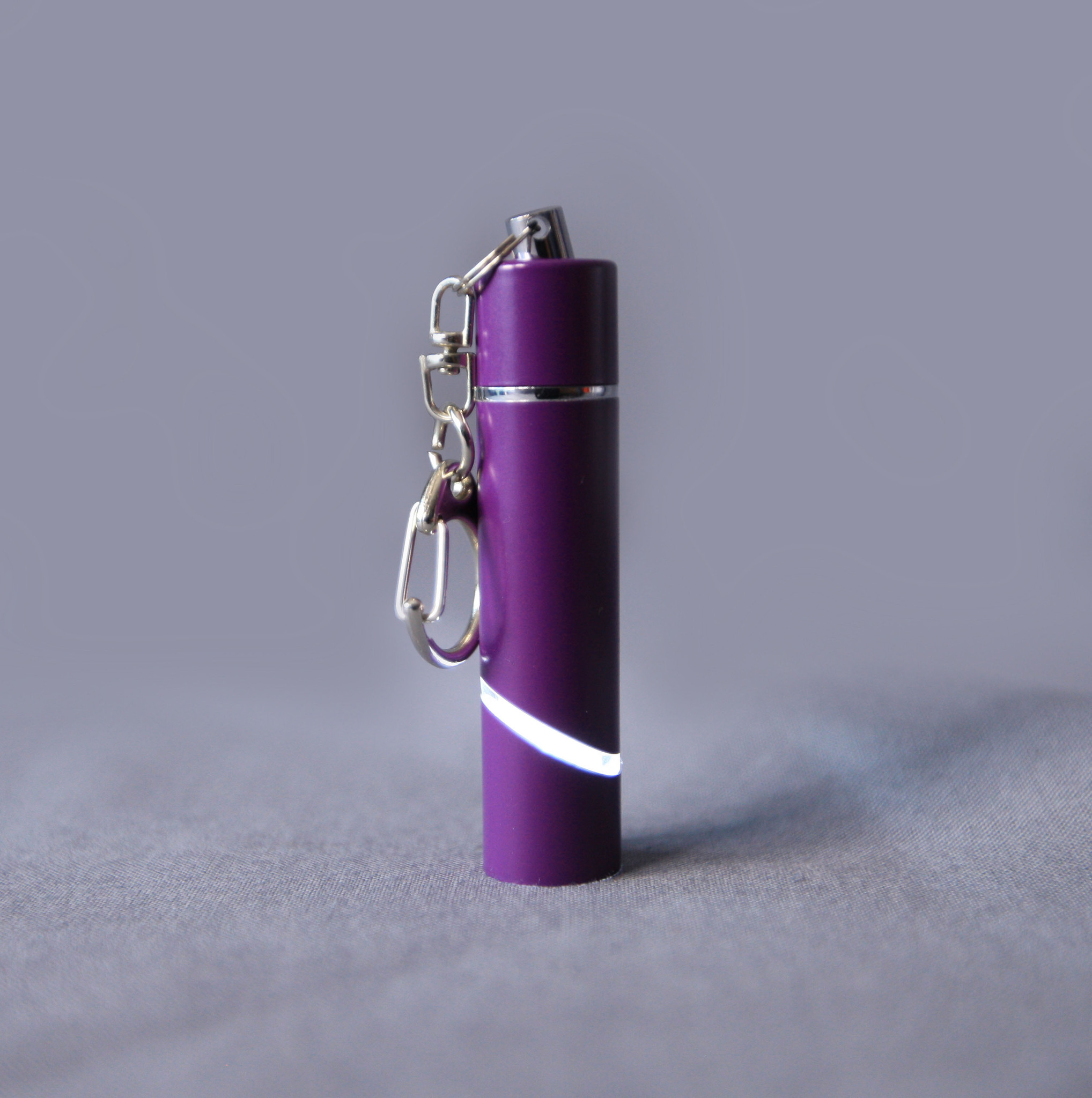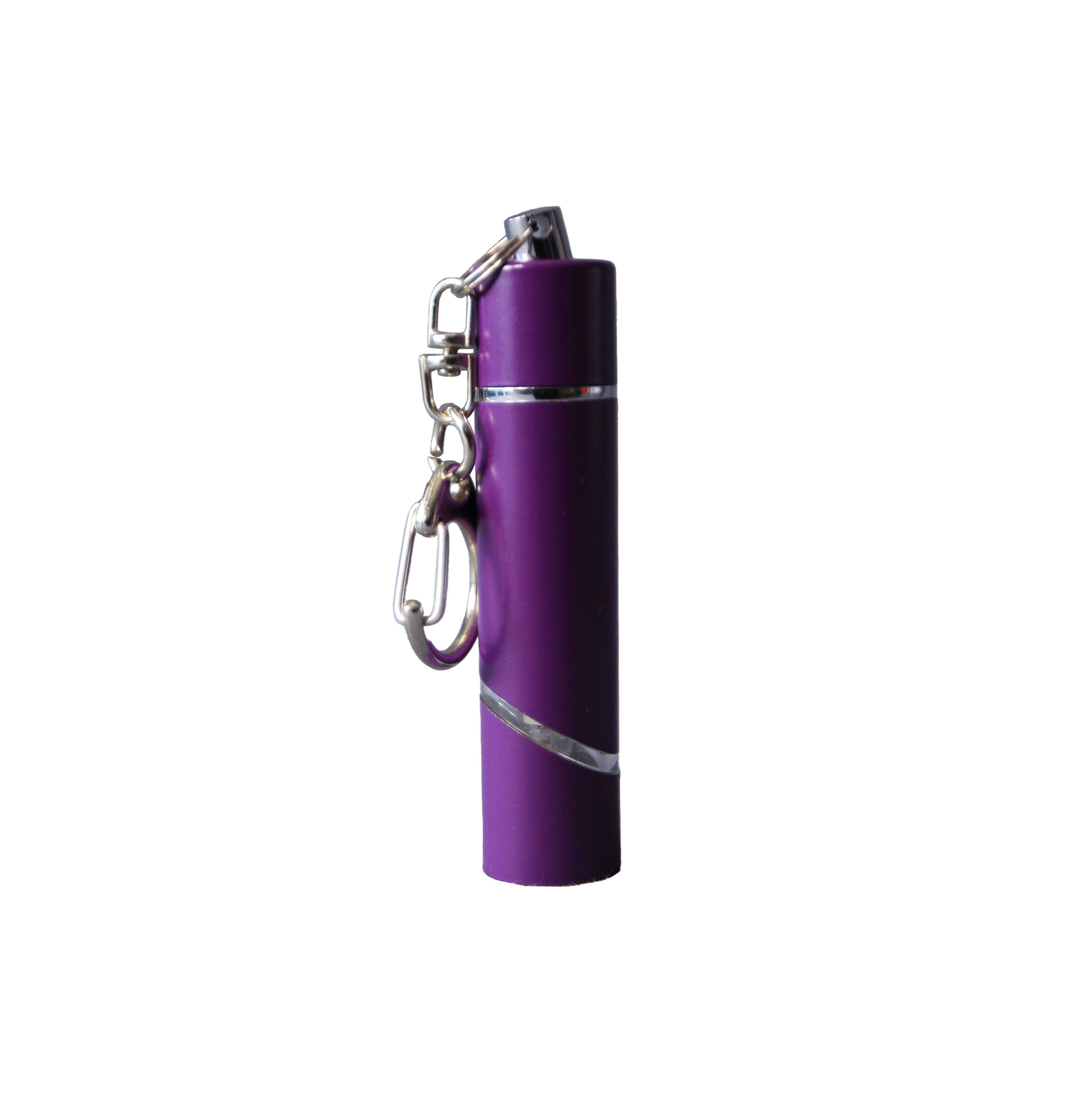 Retractable Metal Flashlight1)Material: aluminum body.2)Description: With one white LED bulb, this product comes with 4 LR41 batteries,sliding mechanism, metal carabiner.3)Size: ø15 x 70mm (+/- 3-4mm)4)Packing: in a transparent opp bag.5)Body color: purple - close to Pantone 526.6