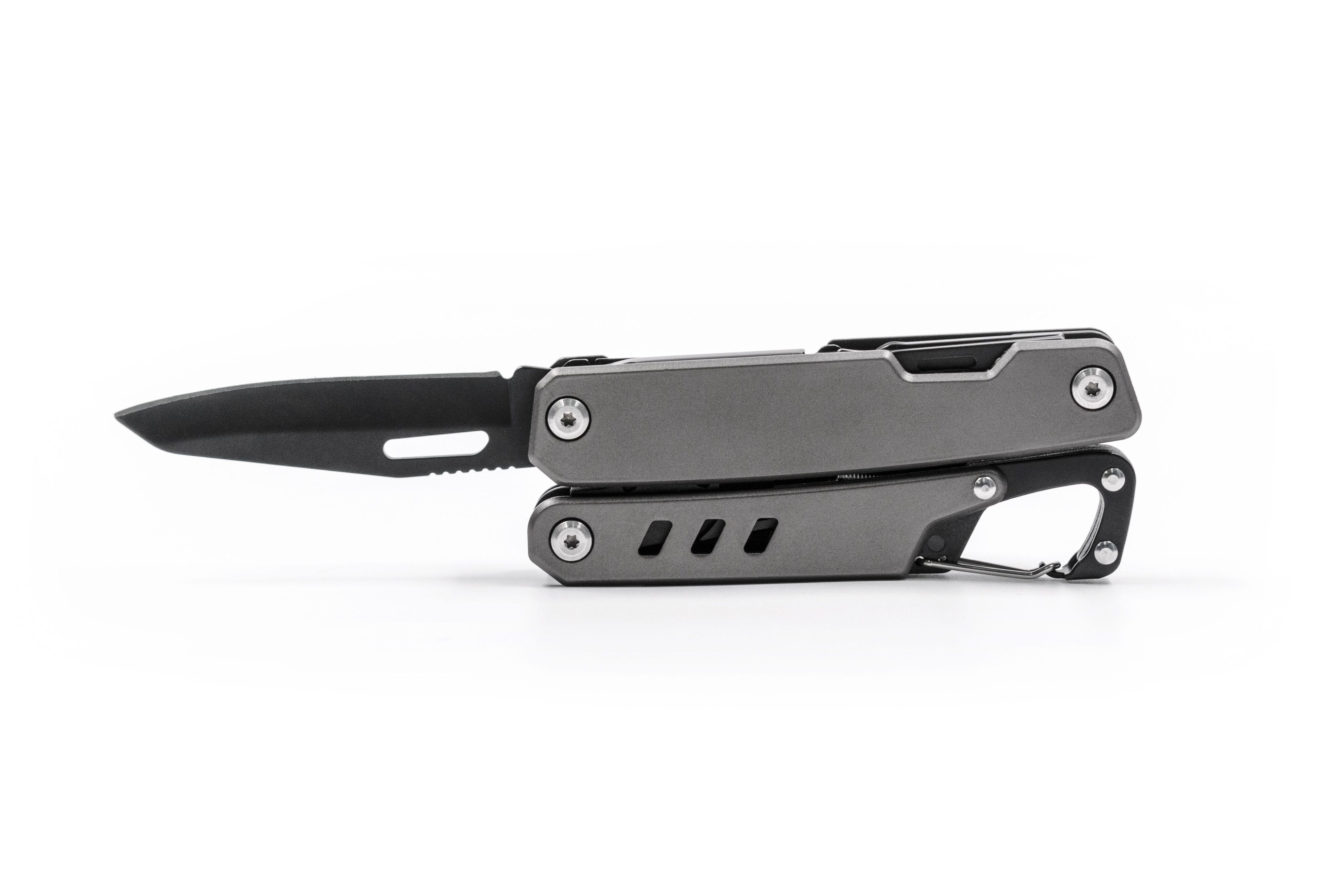 Многофункциональный инструмент 11-в-1 в компактном корпусе из закалённой нержавеющей стали. Включает: плоскогубцы и острогубцы, кусачки, инструмент для зачистки кабеля, нож с фиксатором лезвия, пила по дереву с фиксатором лезвия, крестовая и плоская отвёртки, открывалка для бутылок, консервный нож, карабин. Поставляется с чехлом для крепления на поясе.