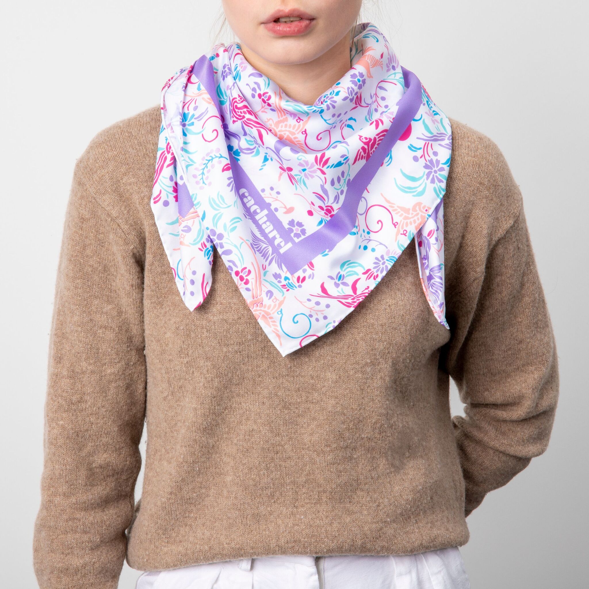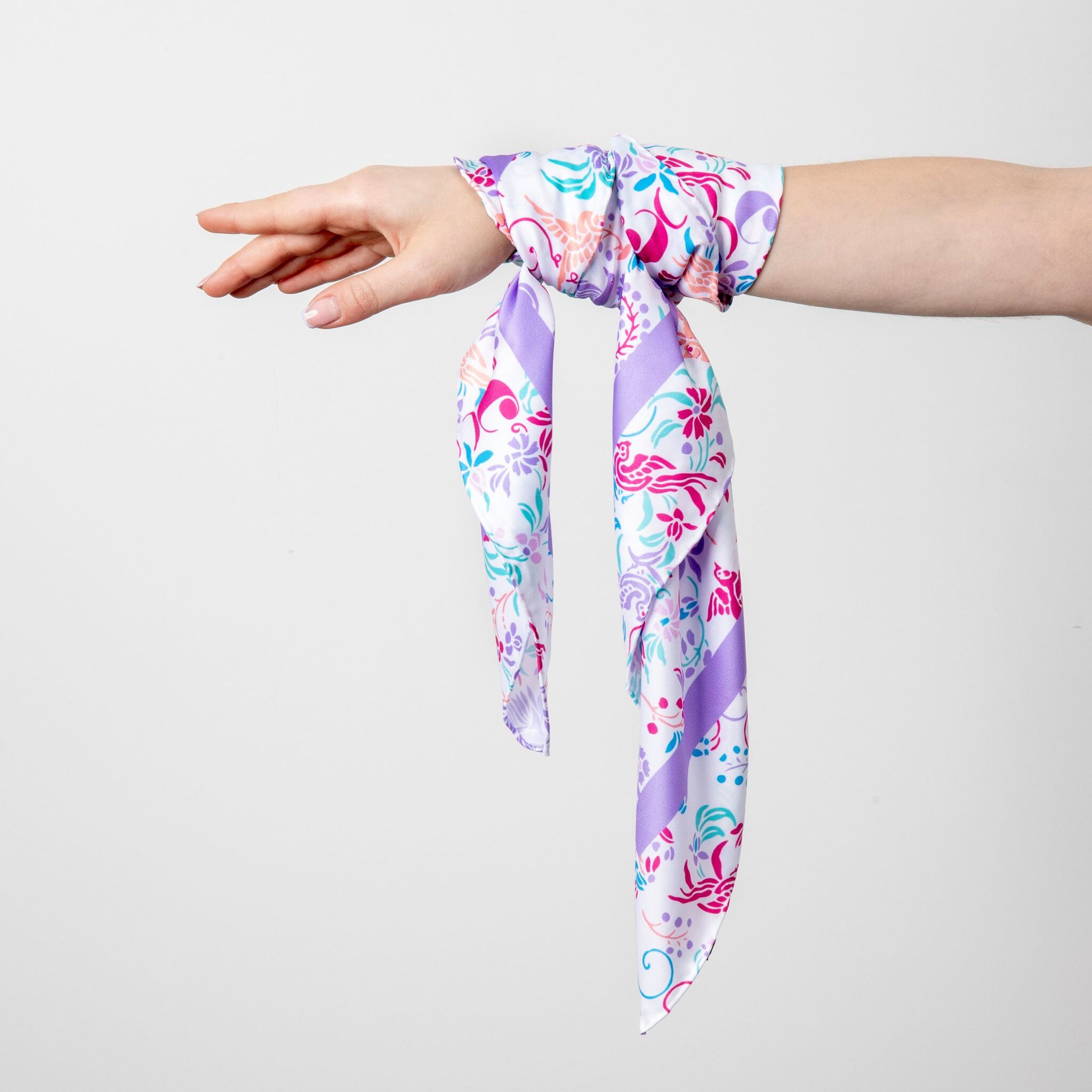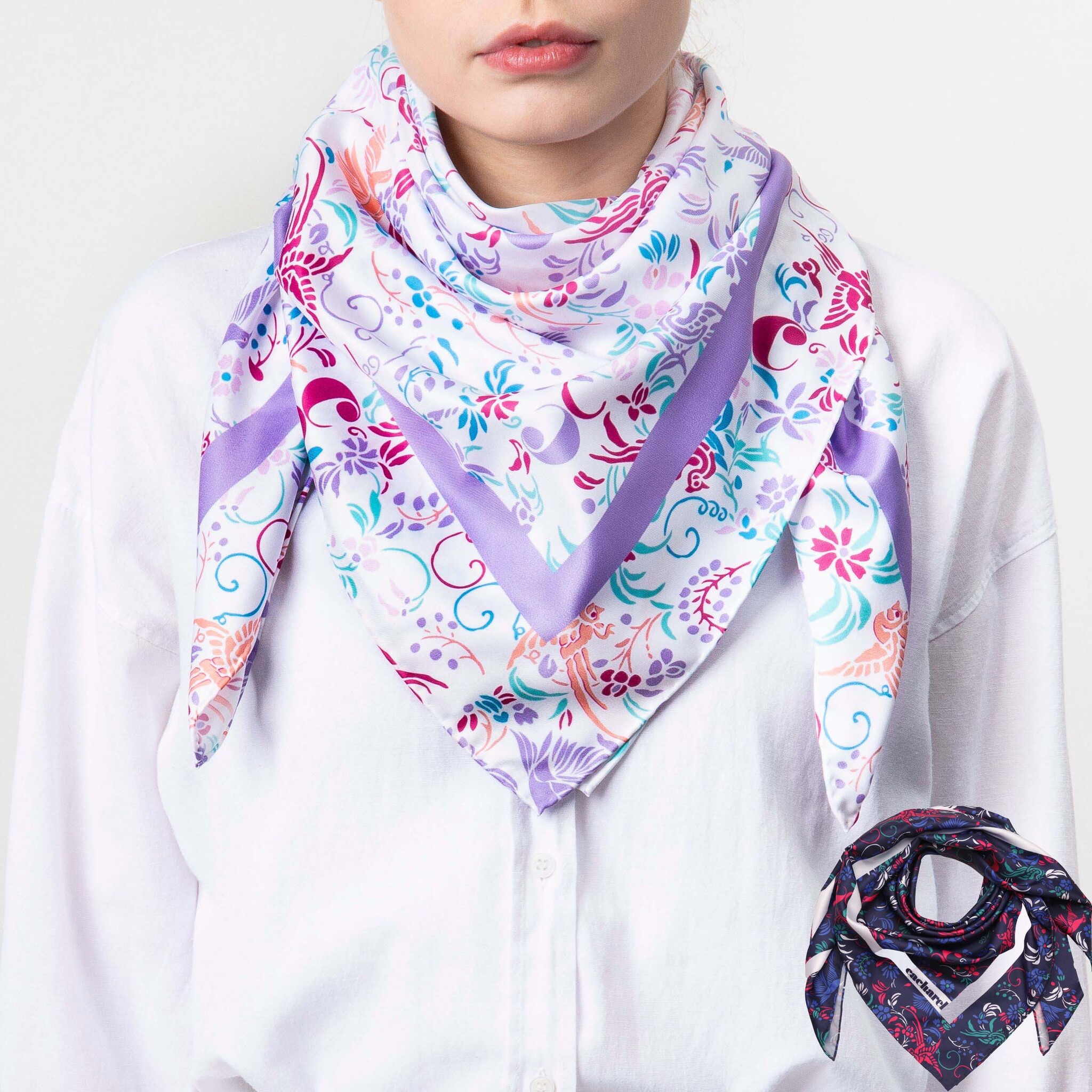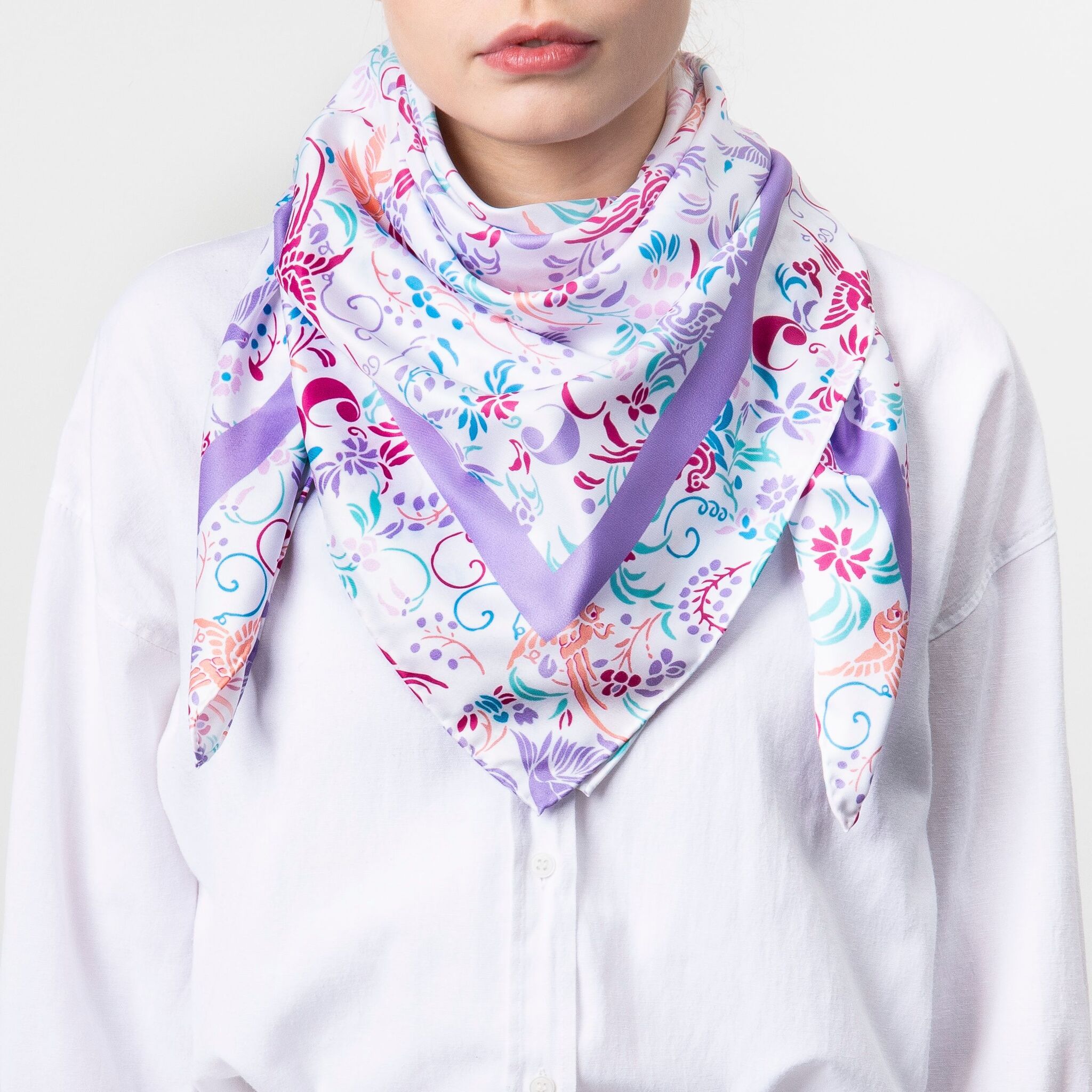 Платок "Alma" напечатан свежими и романтическими цветами и птицами, вдохновленными свободой, с яркими и поэтическими тонами. Этот шарф изготовлен из веганского шелка (полиэстеровый твил). Его размер 90 X 90 см делает его очень универсальным аксессуаром, который можно носить сотнями разных способов.