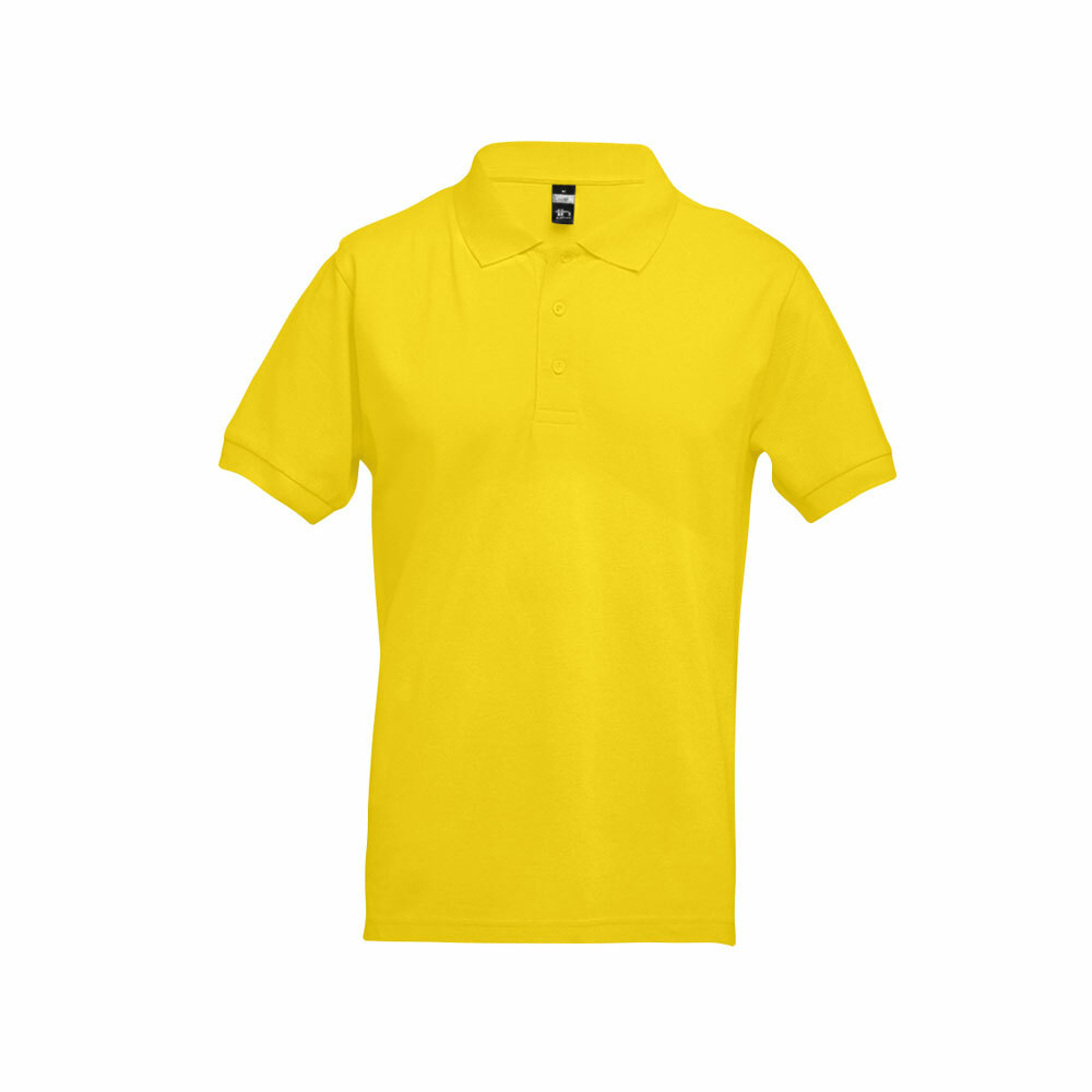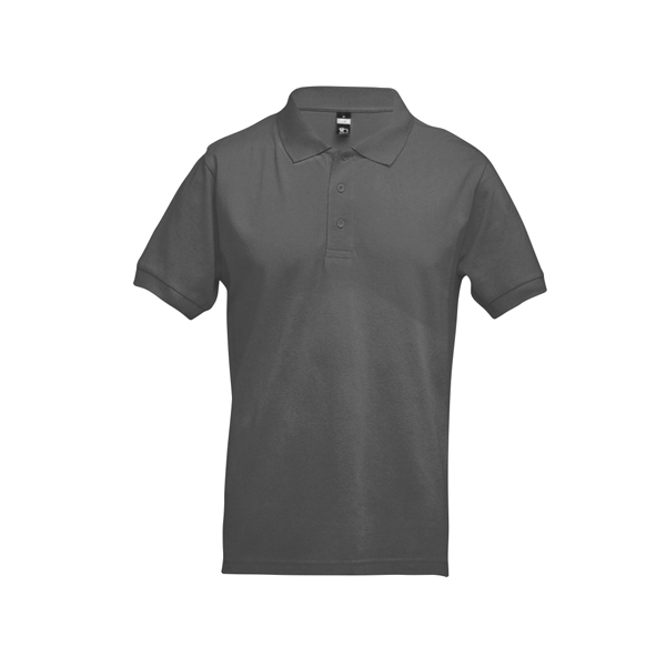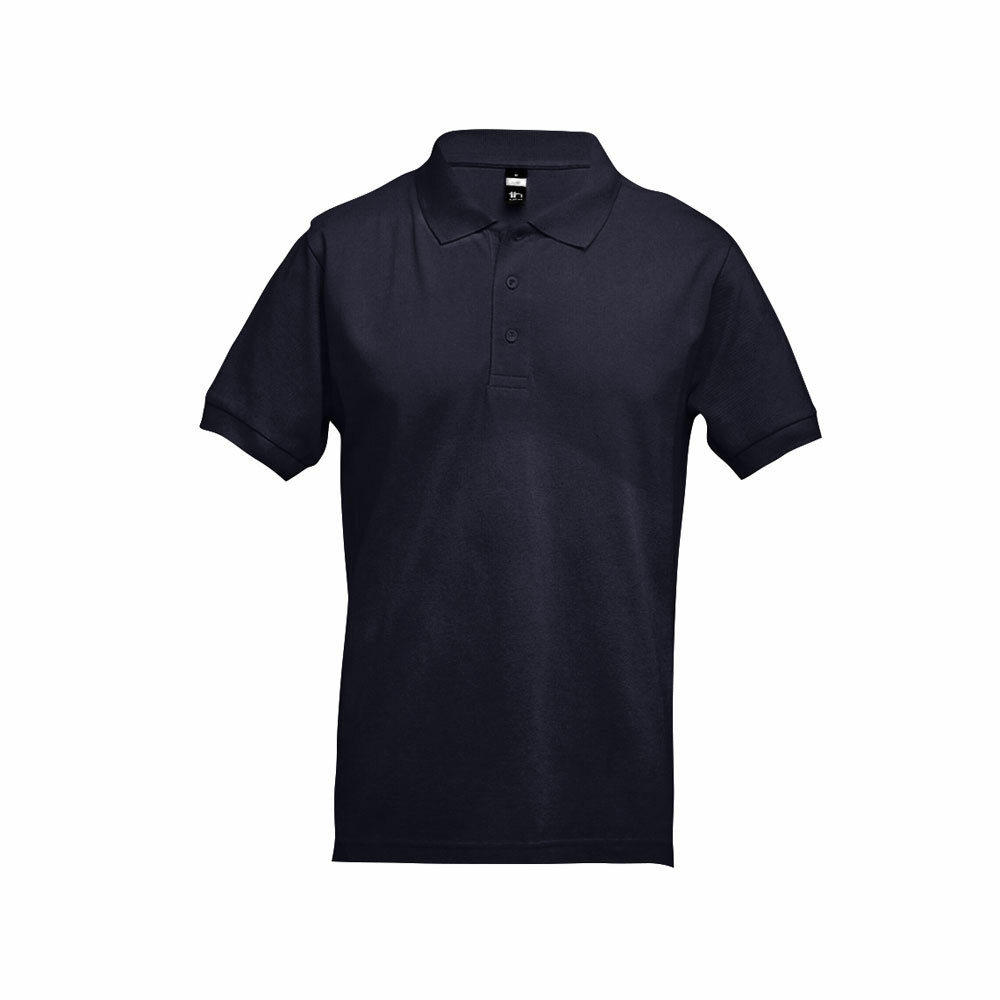 Мужское поло. Трикотаж пике 100% хлопок: 195 г/м². Манжеты и воротник на резинке. Укрепляющая лента на воротнике и планка c 3 пуговицами в тон. Нижняя часть с разрезами. Запасная пуговица на внутреннем шве. Завернутый шов внизу
