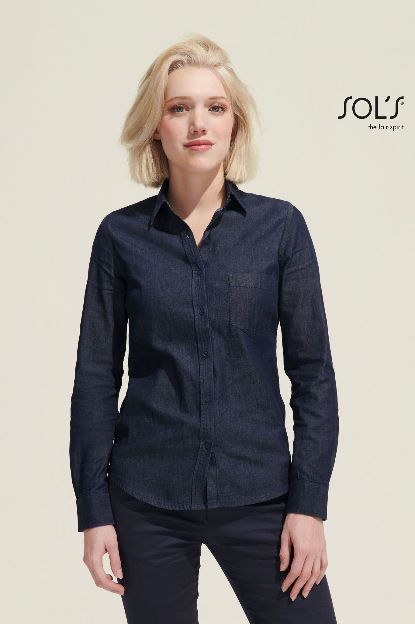 ЖЕНСКАЯ РУБАШКА ИЗ ДЕНИМА. Приталенная модель; Длинный рукав; Классический воротник; Скругленные манжеты на 1 пуговице; Планка с 7 пуговицами; Застегивающийся на пуговицу разрез рукава "капуцин"; Вытачки на груди и спине; Деним Brut; 1 нагрудный карман; Стирать с изделиями такой же цветовой гаммы; Постирать перед первым использованием