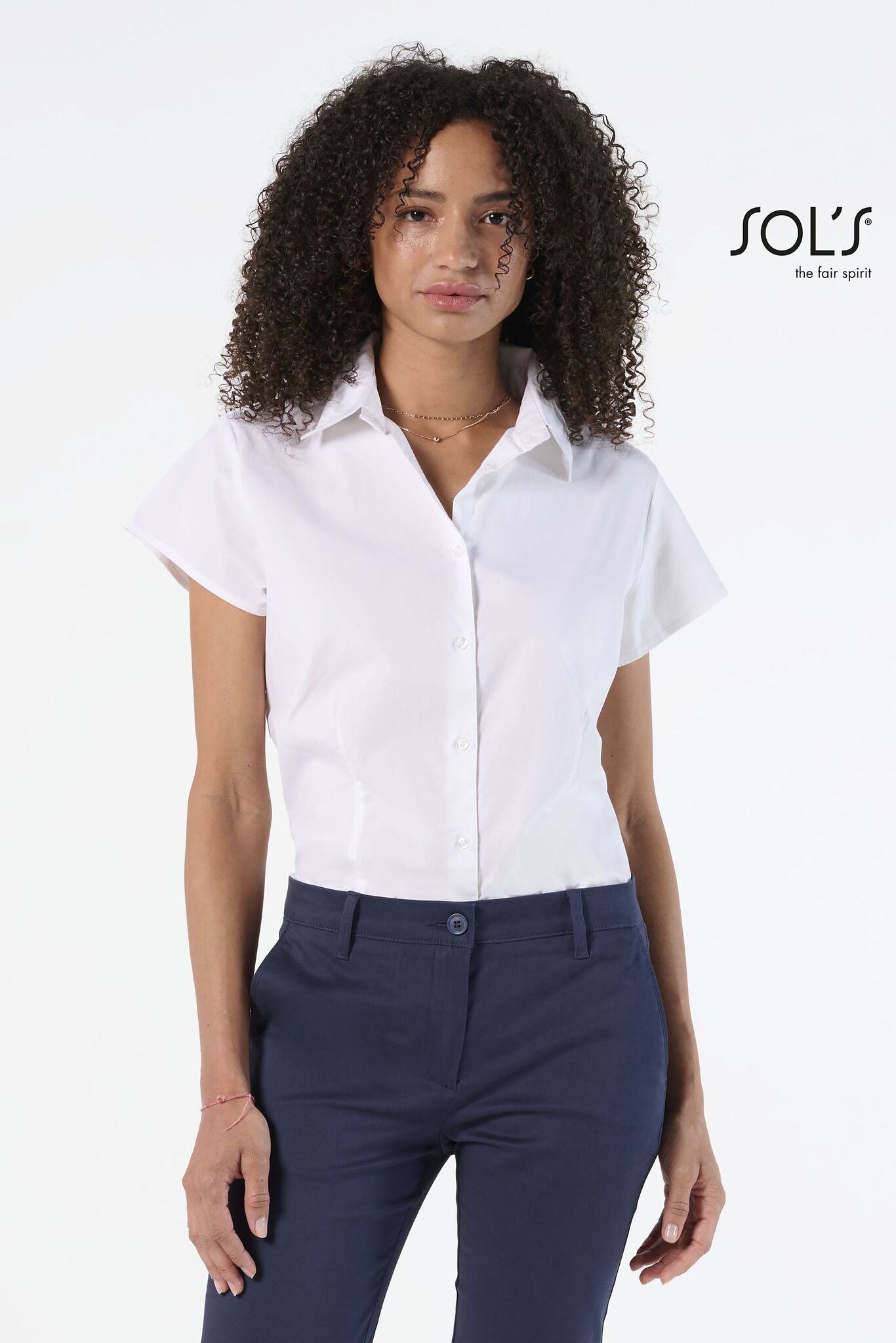 РУБАШКА ЖЕНСКАЯ ИЗ ТКАНИ СТРЕЙЧ С КОРОТКИМ РУКАВОМ. Приталенная модель; Короткий рукав; Воротник на одной пуговице; Планка с 7 пуговицами в цвет изделия; Вытачки спереди и на спине