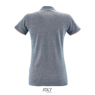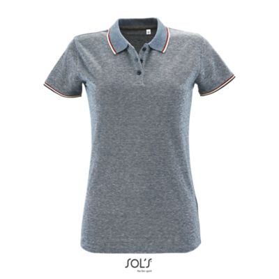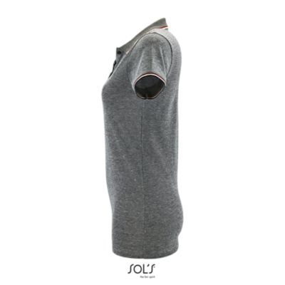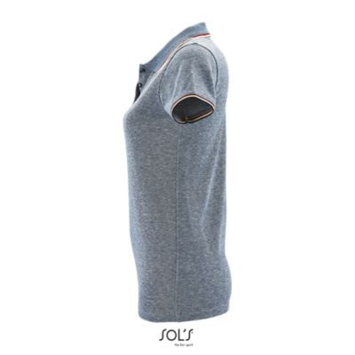 ЖЕНСКАЯ МЕЛАНЖЕВАЯ РУБАШКА ПОЛО. Короткий рукав; Планка с 3 пуговицами; Кроеный трикотаж; Приталенная модель; Воротник и края рукавов из резинки в контрастную полоску