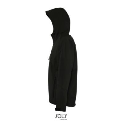МУЖСКАЯ КУРТКА С КАПЮШОНОМ СОФТШЕЛЛ. Карманы на молнии по бокам и на груди; стягивающий шнур на талии; регулируемые с помощью липучек манжеты;; капюшон со стягивающим шнуром.
