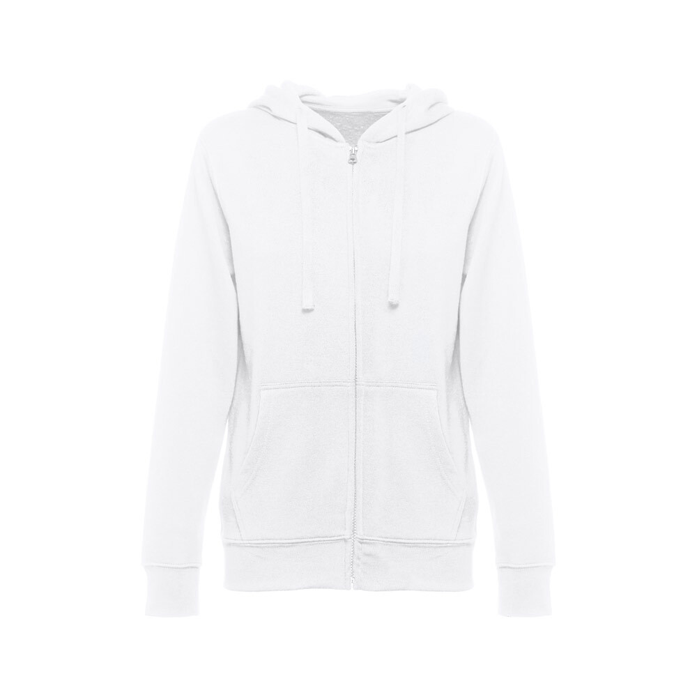 Толстовка женская из 50% хлопка и 50% полиэстера 320 г/м² с внутренним начёсом. Капюшон с подкладкой и цветной застежкой на шнурке. На лицевой стороне имеются два кармана, закрывающиеся на пластиковую молнию. Манжеты и пояс в рубчик. Размеры: S, M, L, XL, XXL