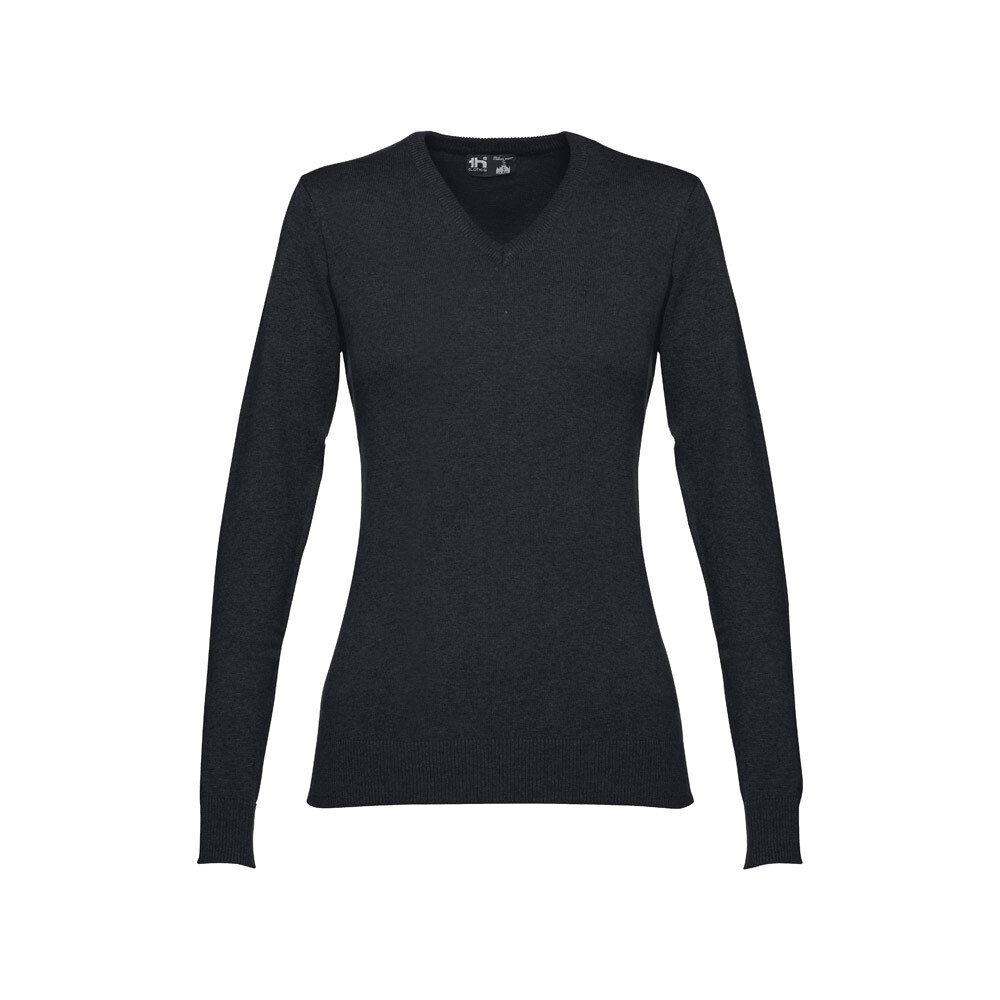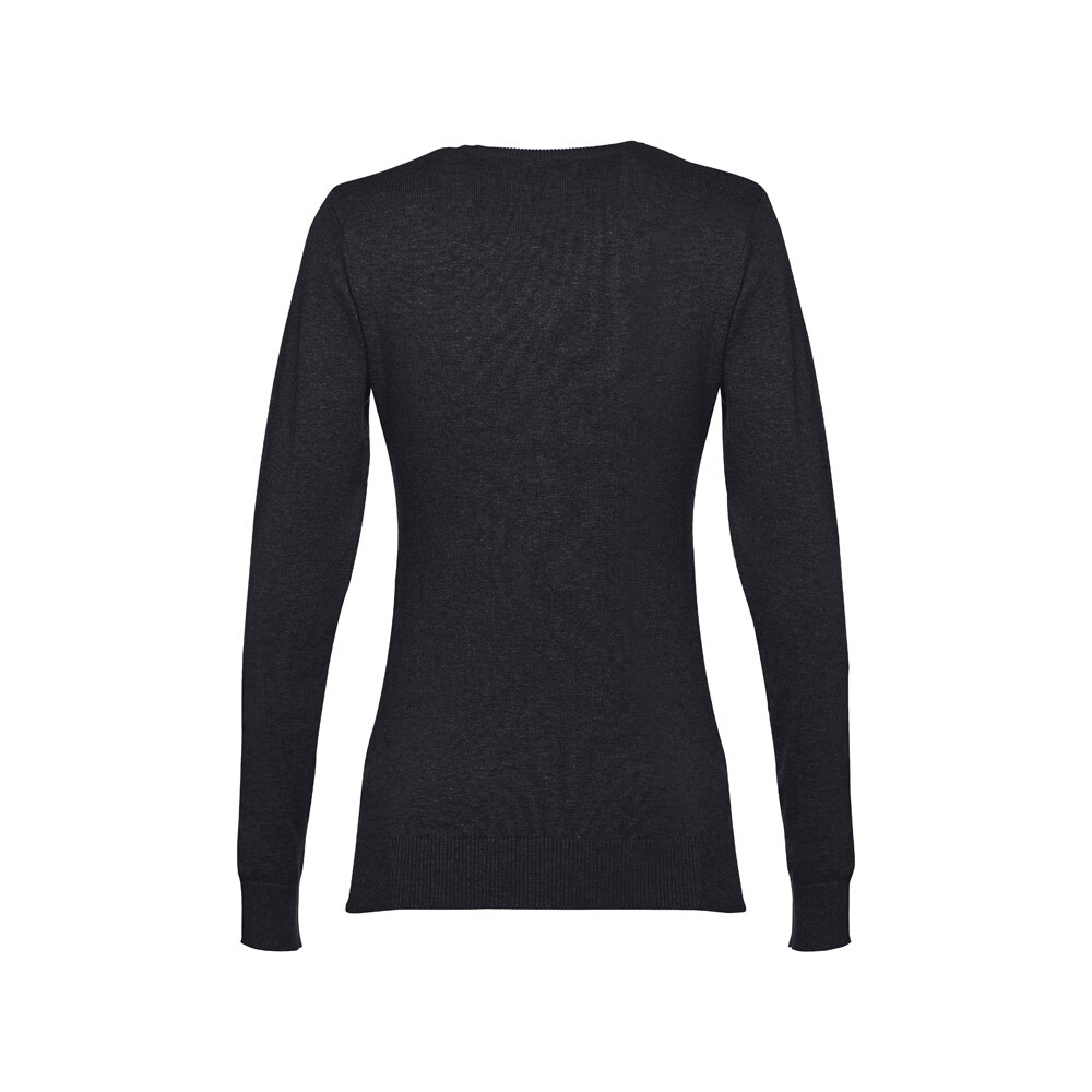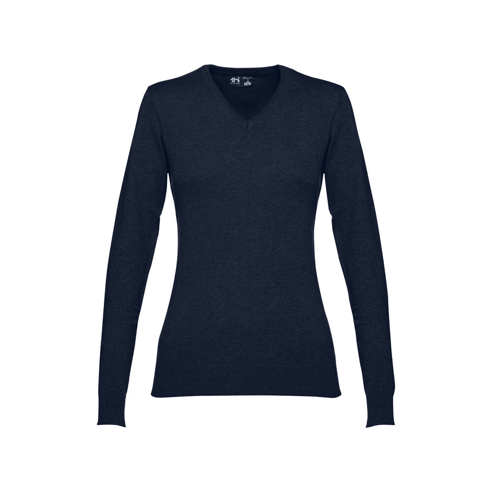 Женский пуловер с V-образным вырезом из 70% хлопка и 30% полиамида (220 г/м²). Ребристый воротник, манжеты и нижняя часть. Вставленные рукава с fully-fashion. Размеры: S, M, L, XL, XXL
